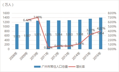 人口是城市经济社会发展的重要元素。2009年和2010年,广州地区常住人口增幅较大,达7%左右,2011年至2014年,常住人口增幅出现较大下降,增幅分别为0.33%、0.69%、0.69%和1.19%,2015年始增幅有所提升,2016年达4.02%。