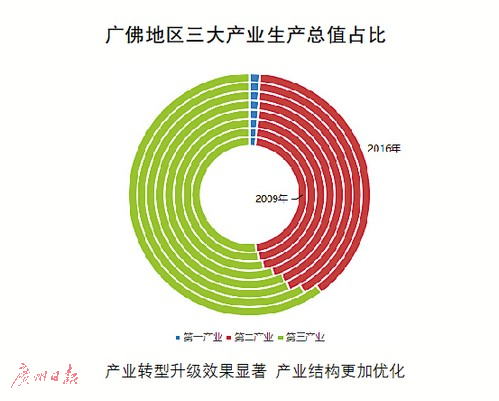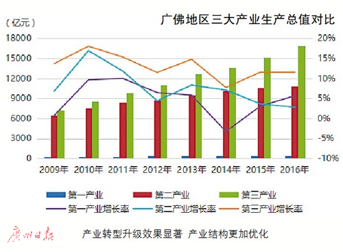 从产业生产总值分析,广佛同城化启动后,第一、第二和第三产业生产总值都有所增长,但增速明显不同,第三产业增幅高于第一、第二产业。数据显示,自2009年开始,广佛地区第三产业占比不断扩大,从2009年的51.94%扩大到2016年60.09%,增加近8个百分点;第三产业生产总值年均增长率达到12.89%。第二产业占比有所缩减,从2009年的46.13%缩减到2016年38.55%,缩减约7.5个百分点,广佛地区产业转型升级效果明显。