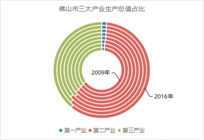 佛山地区第二产业生产总值稳步增长,第三产业发展较快。2009年,佛山第一、第二和第三产业的生产总值分别为95.77亿元、3028.80亿元和1683.74亿元,到2016年,三大产业的生产总值分别为144.60亿元、5110.09亿元和3375.32亿元;三大产业占比从2009年的1.99%、62.99%和35.02%调整为1.68%、59.21%和39.11%;第一、第二和第三产业年均增长率分别为6.06%、7.76%、10.45%,第三产业发展迅速。