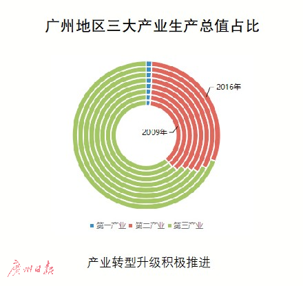 数据显示,2009年,广州第一、第二和第三产业总值分别为172.28亿元、3405.16亿元和5560.77亿元,到2016年为239.28亿元、5751.59亿元和13556.57亿元;占比从1.89%、37.26%和60.85%调整为1.23%、29.42%和69.35%;第一、第二和第三产业年均增长率分别为4.80%、7.78%和13.58%。