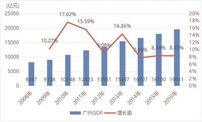 2008年,广州地区生产总值为8287.38亿元,2009年广佛同城化启动,广州地区生产总值从9138.21亿元增长到2016年的19610.94亿元,年均复合增长率11.37%,2016年地区生产总值是2008年的2.37倍。在年增长率上,2010年达到17.62%,为历年最高,其次是15.59%(2011年)、14.36%(2013年)。