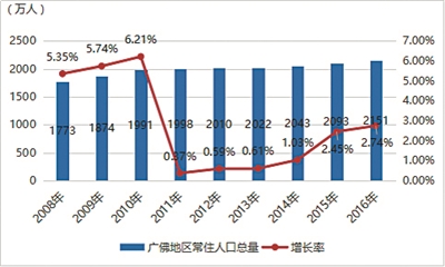 佛山地区常住人口在2009年和2010年增幅较高,分别为4.57%和4.72%,但2011年至2016年,人口增幅一直处于低位,仅2015年增幅为1.09%,其余年份均低于1%。