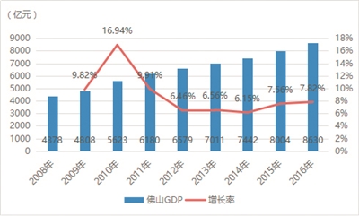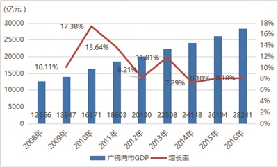 广佛同城化启动以来,佛山地区生产总值从2008年的4378亿元,增加到2016年的8630亿元,增幅达97.12%,年均复合增长率达8.85%。其中以2010年地区生产总值增幅最大,为16.94%,其次是9.91%(2011年)、9.82%(2009年)。增长幅度最少为2014年的6.15%。