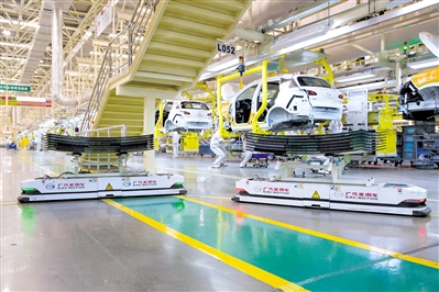 总装车间内常能遇到智能运输机器人。