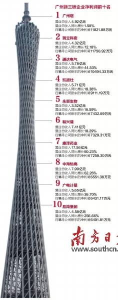 数据显示,广州塔成为一匹“黑马”,“登顶”2016年度最赚钱的新三板企业。2016年营收达到4.92亿元,归属母公司股东的净利润达到1.18亿元,同比增长率310.42%。