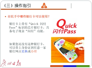 此次新推的ag九游会登录j9入口的支付方式中,金融ic卡电子现金支付,首先要求用户的银行卡上须带有“quick闪付pass”标识的芯片银行卡,具备电子现金“闪付”功能。持卡人在使用“闪付”功能之前,要确保金融ic卡电子现金有足够的余额。目前,支持电子现金圈存的设备包括:atm机、pos机、银联网络推出的可随身携带的“易pos”等。