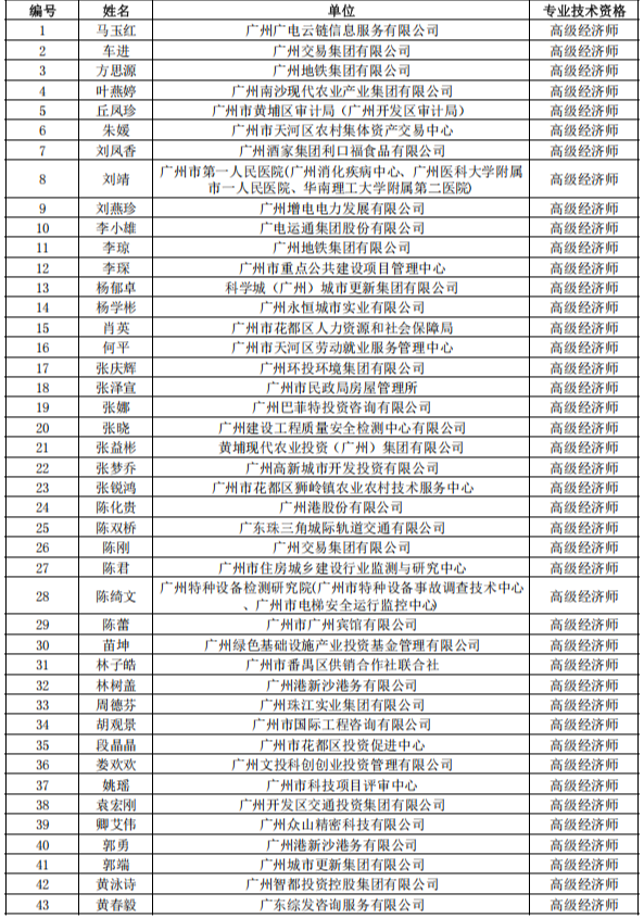 根据职称评审政策要求,经广州市高级经济师资格评审委员会评审通过,下列同志拟取得正高级、高级专业技术资格,现予公示(广州市人力资源和社会保障局公示链接:https://rsj.gz.gov.cn/ywzt/rcgz/gzzc/tzgg/zcphgs-gj/)。公示期为5个工作日,从2025年6月27日起至2025年07月03日止。
