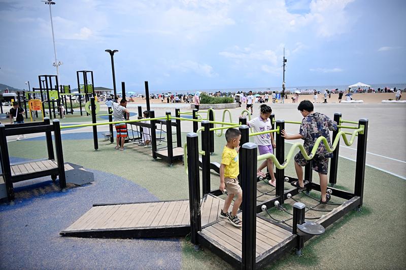 8月14日,小朋友在青岛崂山区石老人海水浴场健身游乐区玩耍。新华社记者 李紫恒 摄